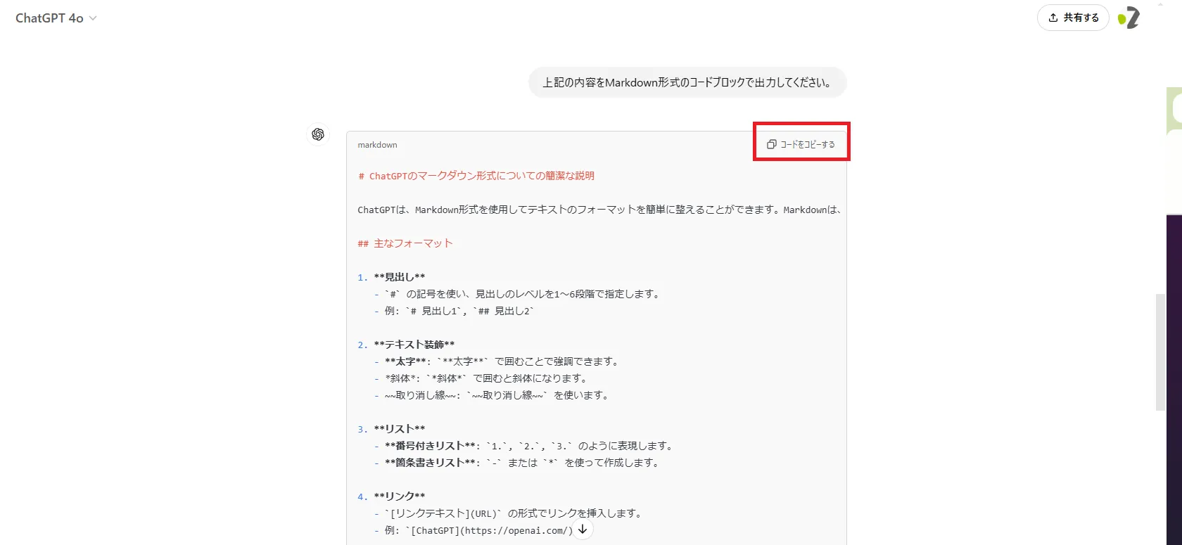 この指示により、生成されるMarkdown内容がコードブロック内に入り、Markdownテキストとしてそのまま貼り付けて使用できます。