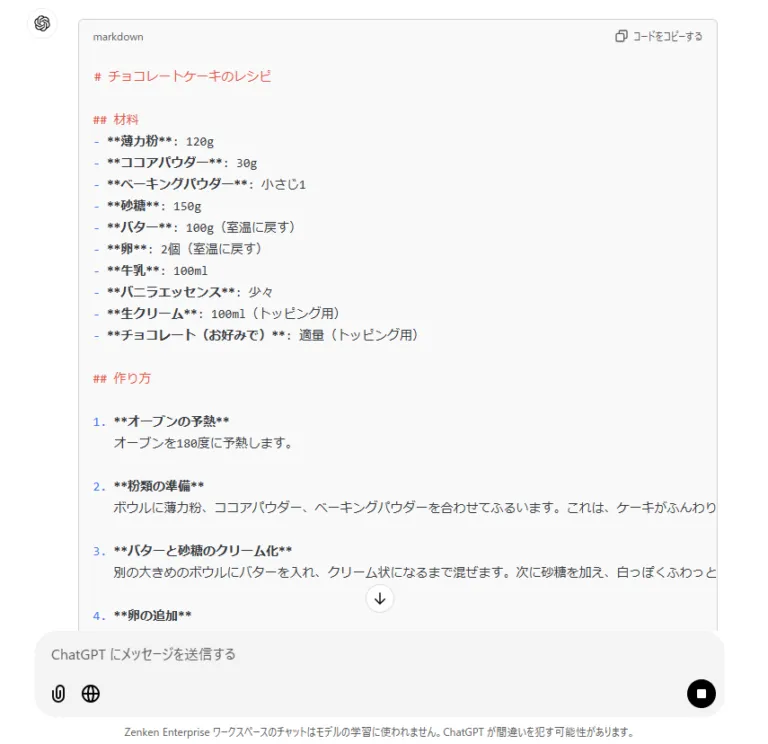 ✓「チョコレートケーキのレシピをMarkdown形式で出力してください。以下のような構造にしてください: